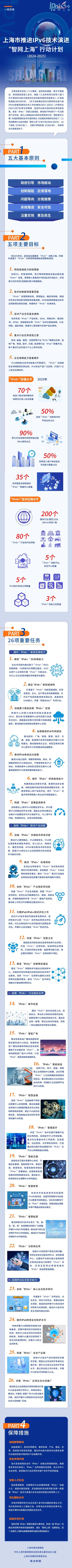近日,上海市通信管理局、上海市委网络安全和信息化委员会办公室、上海市发展和改革委员会联合印发《上海市推进IPv6技术演进“智网上海”行动计划(2024-2025)》(下称《计划》),提出将高标准全面建成“IPv6+”创新之城,构建形成基于“IPv6+”的新型网络基础设施智能底座,IPv6单栈试点范围和场景不断扩展,“IPv6+”标准制定、技术研发和产业链协同体系初步形成,重点行业“IPv6+”融合应用水平大幅提升,IPv6安全防护能力显著增强,基于IPv6的下一代互联网产业生态基本构建,为上海全面建设数字经济、数字生活、数字治理的城市数字化转型筑牢“新基座”。