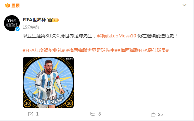 北京时间1月16日,FIFA年度颁奖典礼,梅西当选2023世界足球先生,他击败了3人候选中的哈兰德和姆巴佩。这是梅西在2022年获奖后蝉联世界足球先生,同时也是他生涯第八次获得该奖项,继续刷新历史纪录。由于梅西要备战热身赛,没有来到颁奖现场。