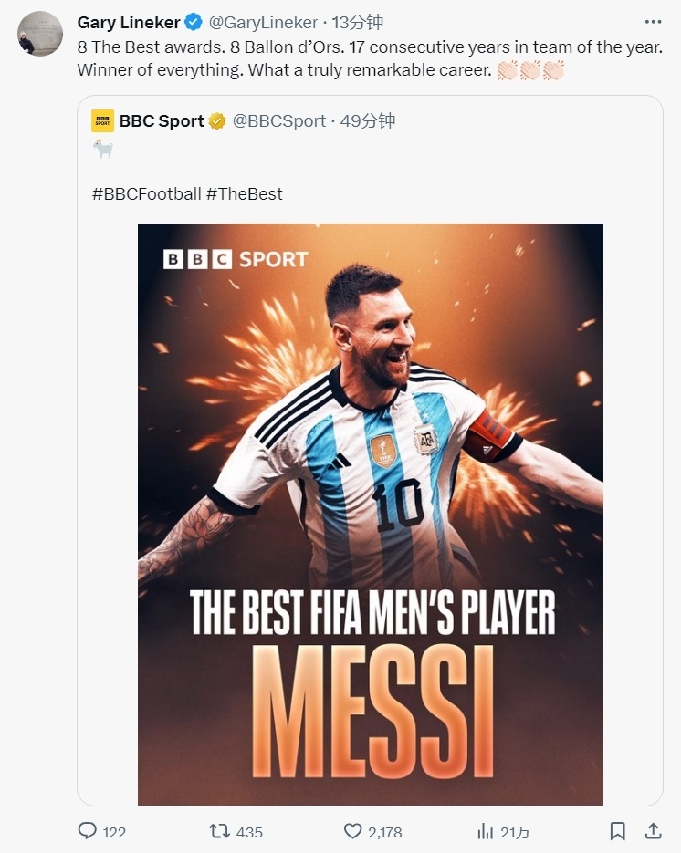 梅西当选FIFA2023年世界足球先生,被誉为“足球绅士”的莱因克尔发文称赞梅西。